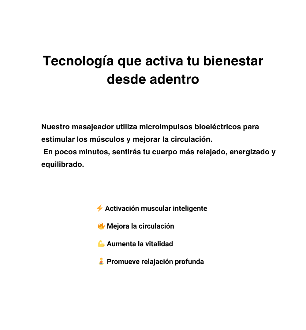 Desarrollado con tecnología de simulación corporal avanzada, combina impulsos eléctricos de baja frecuencia y ondas bioeléctricas para estimular tus músculos de forma natural, activar la circulación y promover la recuperación del cuerpo desde adentro hacia afuera.